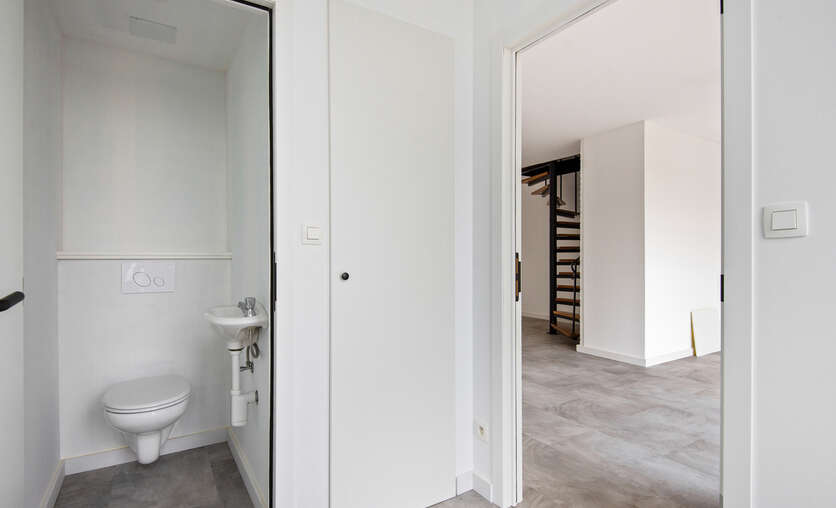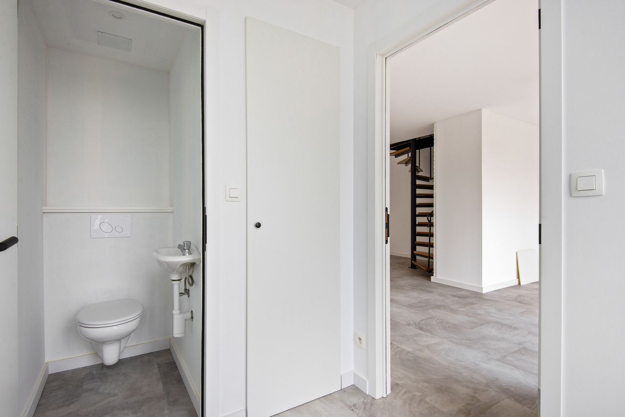 Gelijkvloers: inkomhal met gastentoilet, aparte berging, ruime en open leefruimte met zithoek, eetgedeelte en aansluitende keuken.